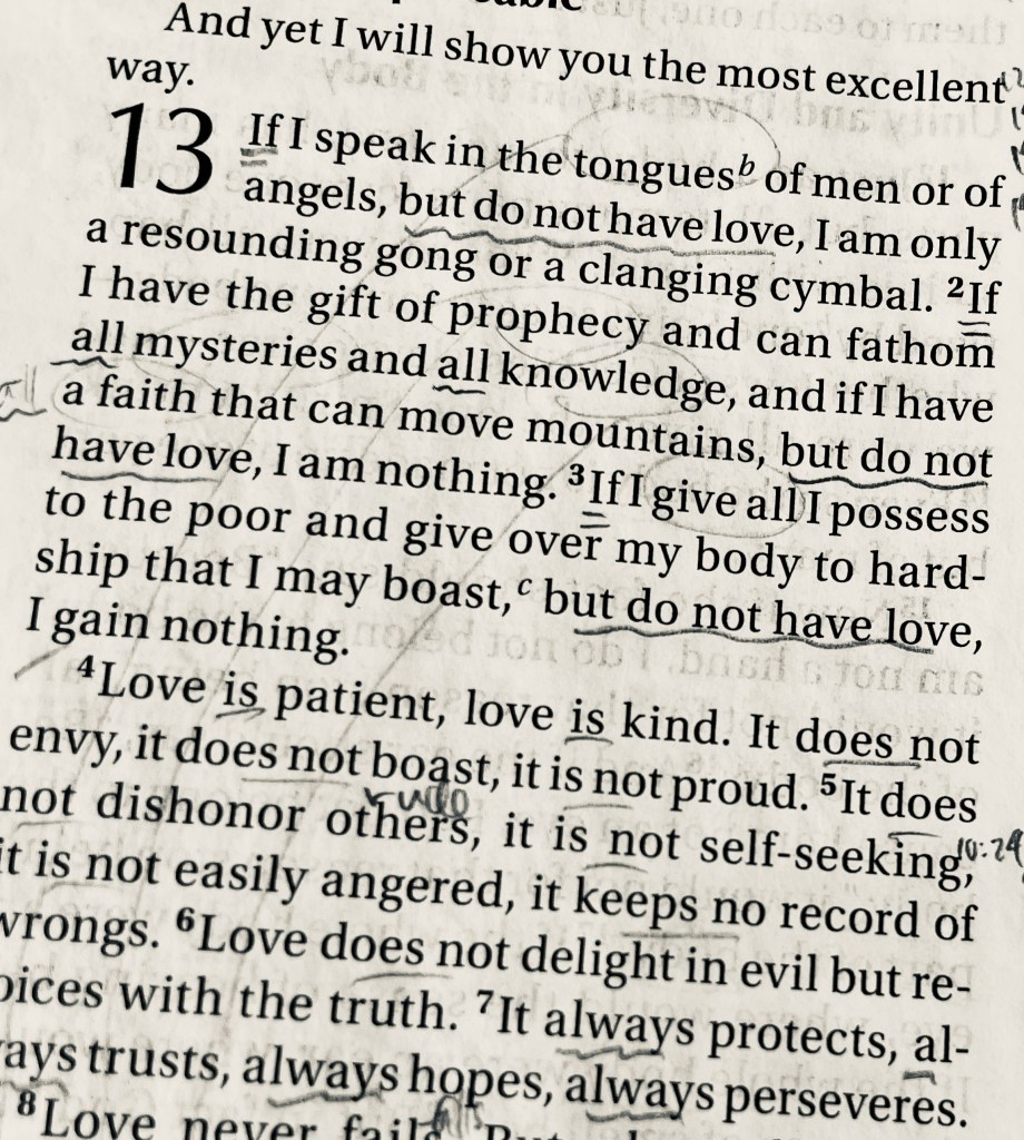 We aspire to the sort of love described in 1 Corinthians but often fall short. Outside of grace this can be utterly defeating. But inside the gospel, inside the grace of God found in Jesus Christ, we find that God meets us in our failure and grows us there. We are stretched by God to become more like God, better image-bearers of God as we run into our limitations. For it is there that God wants to teach us, to train us, to develop within us a love that increasingly reflects divine love. In light of that, perhaps it is good to read the words of 1 Corinthians 13 more like a prayer: